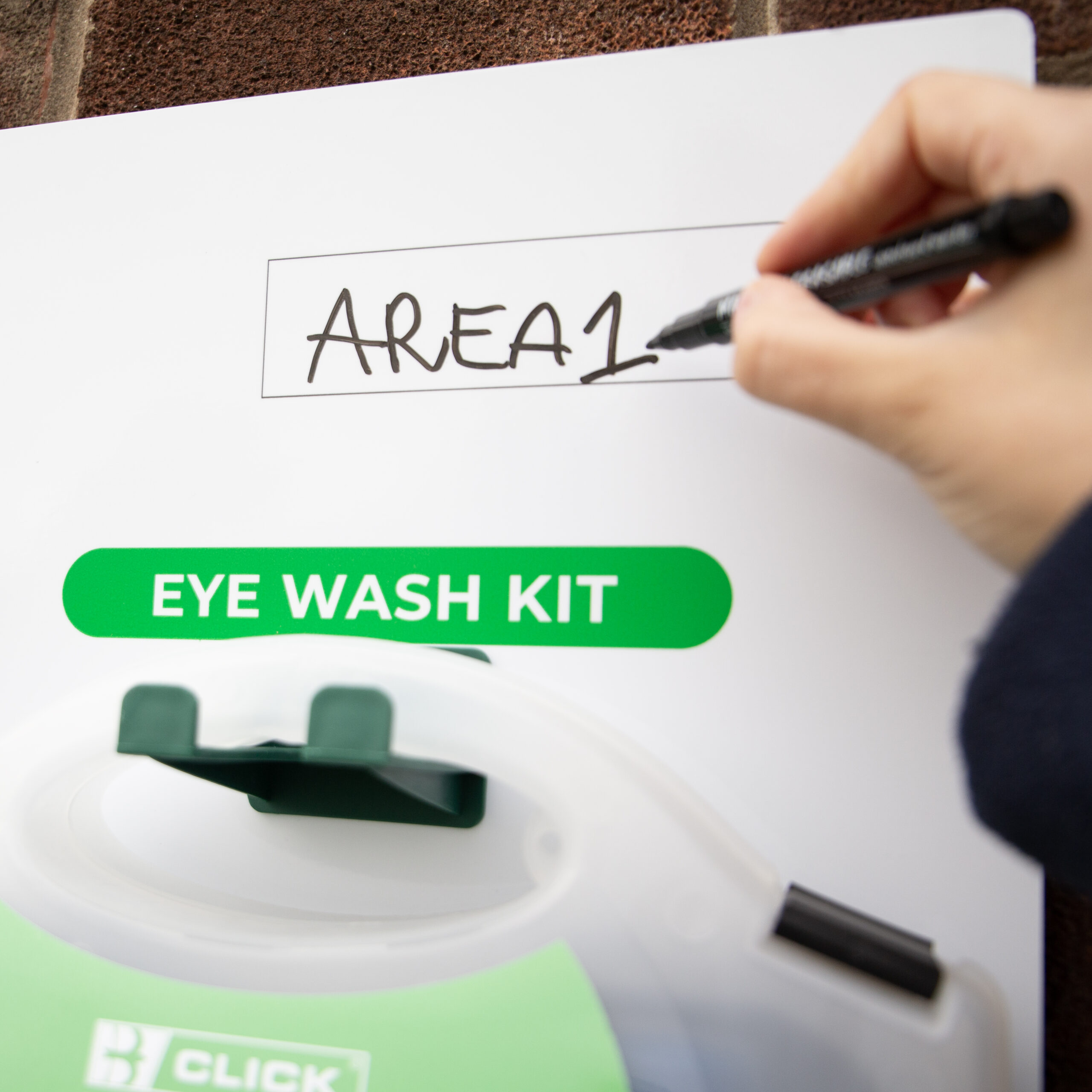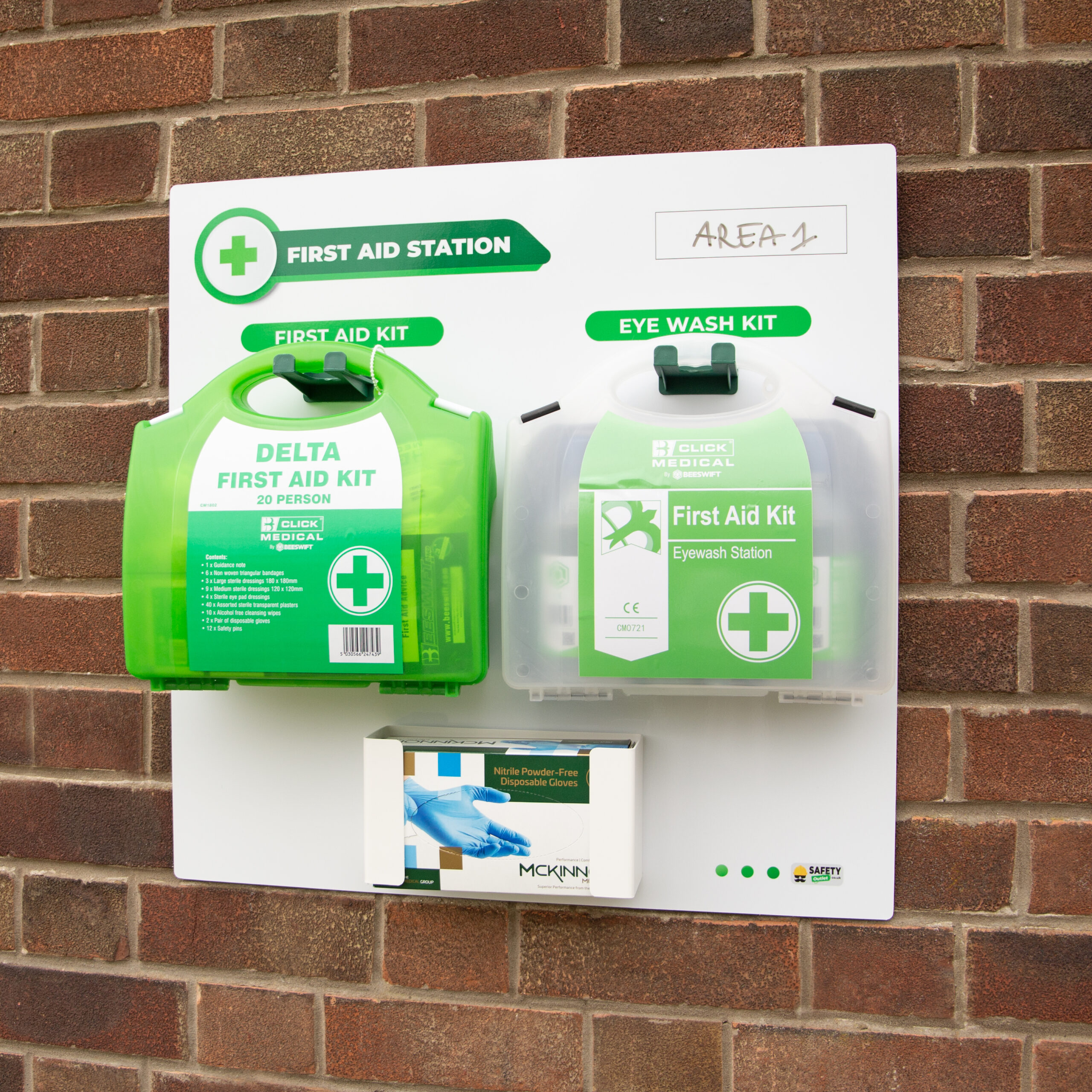 Compact safety point with essential first-aid supplies and a dry-wipe space for area, team, or ownership details.
